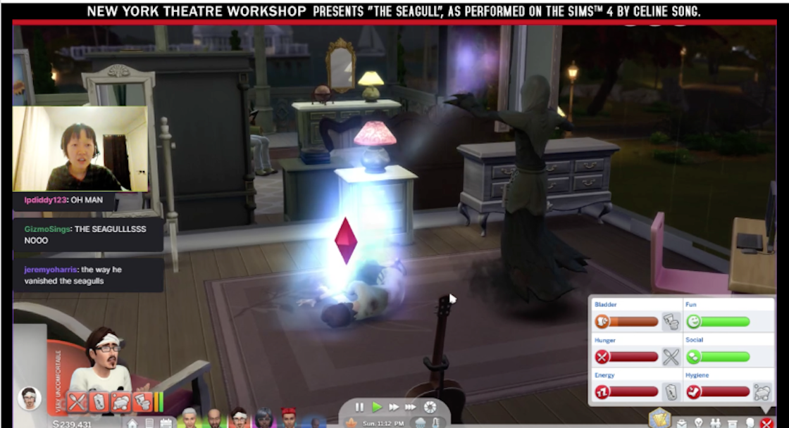 Celine Song (upper L) in a livestreamed production of The Seagull in The Sims 4. Courtesy of New York Theatre Workshop