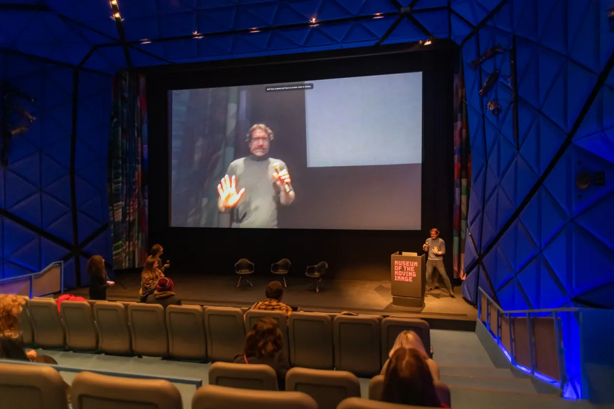 Apart from the year-round exhibition of finished films at the museum, the public-facing aspect of the institution is also reflected in the festival’s Working on It program, a series of daytime workshops and work-in-progress presentations open to the public. In a conversation with Documentary, Hynes shared how bringing work-in-progress sessions to First Look has been “less about them being industry-focused events and more about them being public”—opening up that door to the film-goers and members of the community to learn about the artistic process, how films are made, and the types of creative decisions that are taken. There is also an element of unpredictability to such sessions due to the possibility of members of the public or other attending filmmakers (who may not be part of the filmmaker’s cohort as one would have in a rough-cut screening or a lab) coming to a session and giving their perspective on the work. Works at different stages of development, from films close to being finalized to projects in the very early stages of development, are welcomed. This year, one such project was brought by visual artist, playwright, and filmmaker Robin Frohardt, who presented early materials for a new film that straddles puppetry and documentary.