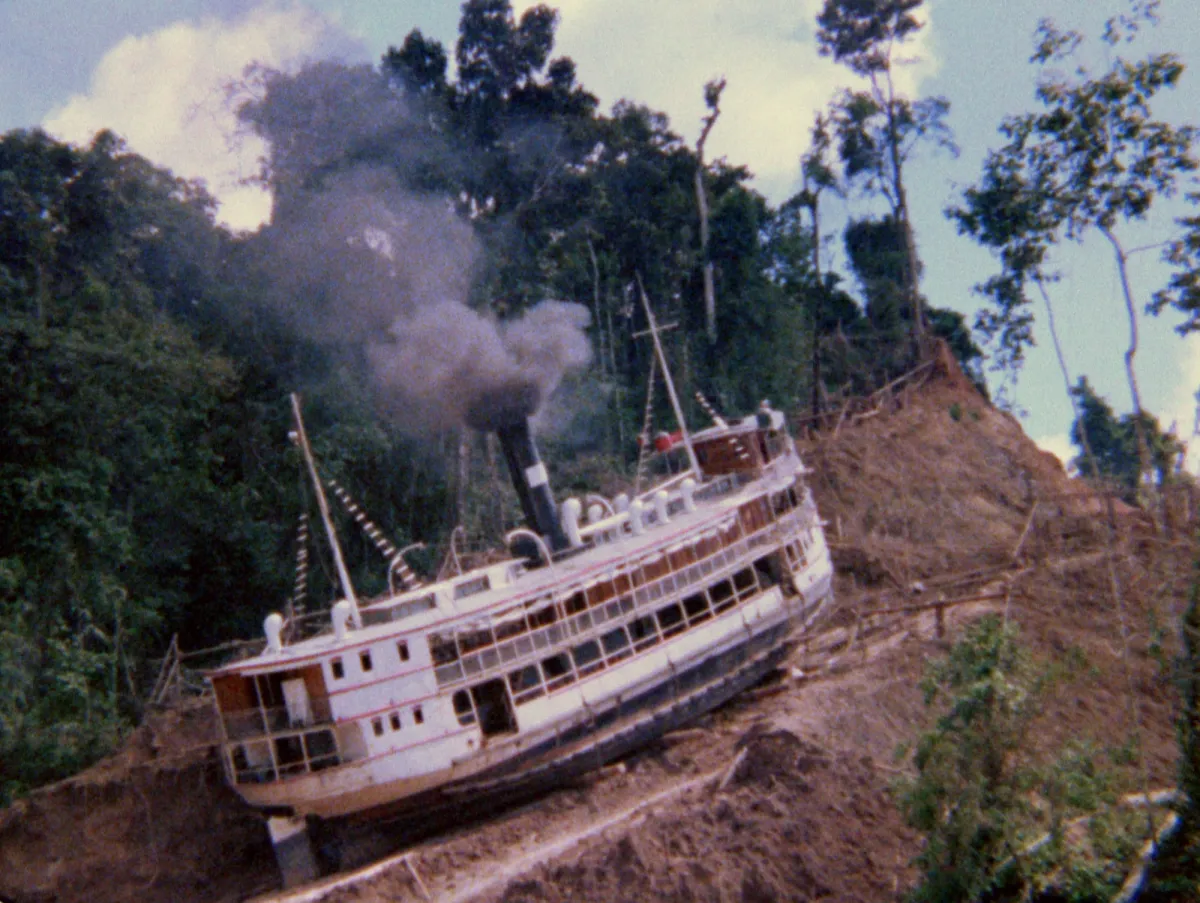 Reflecting on the aftermath of Fitzacarraldo’s disastrous production, Herzog—in the face of countless injuries, and multiple lives lost—claims that “these are the costs you have to pay. … One starts to question the profession itself,” he continues, keenly aware of his megalomania but unable to take full responsibility for it. Given the chance to run a smooth production in the areas surrounding Iquitos, he pressed on into the volatile jungle. Warned by an expert that the steamship stunt had a 70% chance of failing, and killing upward of 60 Aguaruna people in the process, he soldiered on. What we are ultimately faced with is a man determined to view the monumental risk and folly of his production as something beyond his control; a jungle curse, a terrible duty bestowed from on high, a sentence from the gods.
