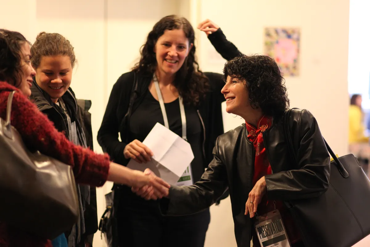 Nancy Buirski greeting festival guests at Full Frame in 2009. Photo credit: Steve Bognar