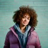 Headshot of a black woman with an afro and a puffer jacket in front of a green brick wall