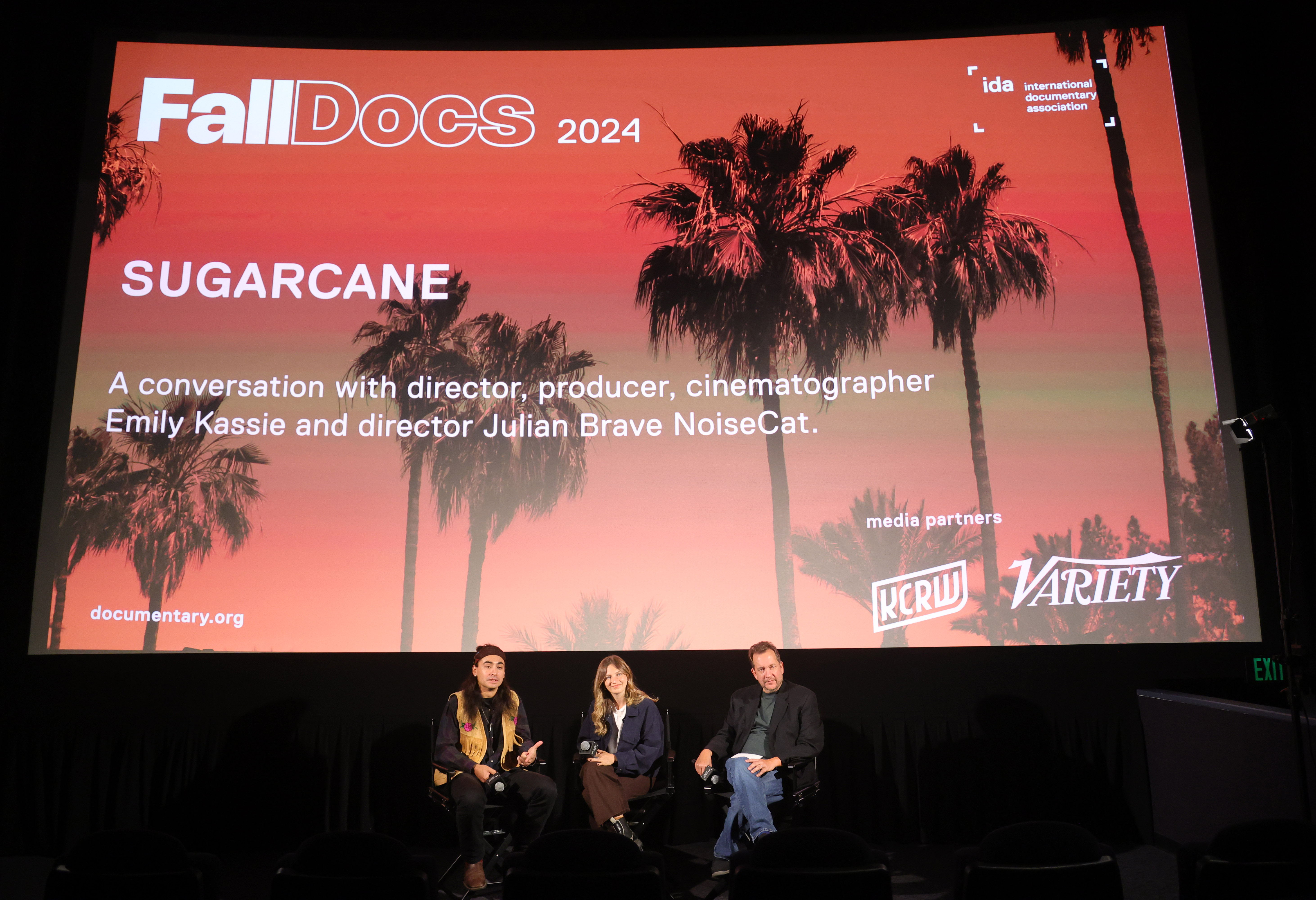 FallDocs 2024. Sugarcane Q&A with director Julian Brave NoiseCat, Emily Kassie, and moderator and film journalist Robert Abele.