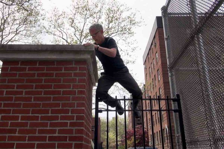 Jay Rosenblatt wearing all-black climbing his school’s fence. From Jay Rosenblatt’s ‘When We Were Bullies.’ Courtesy of HBO.