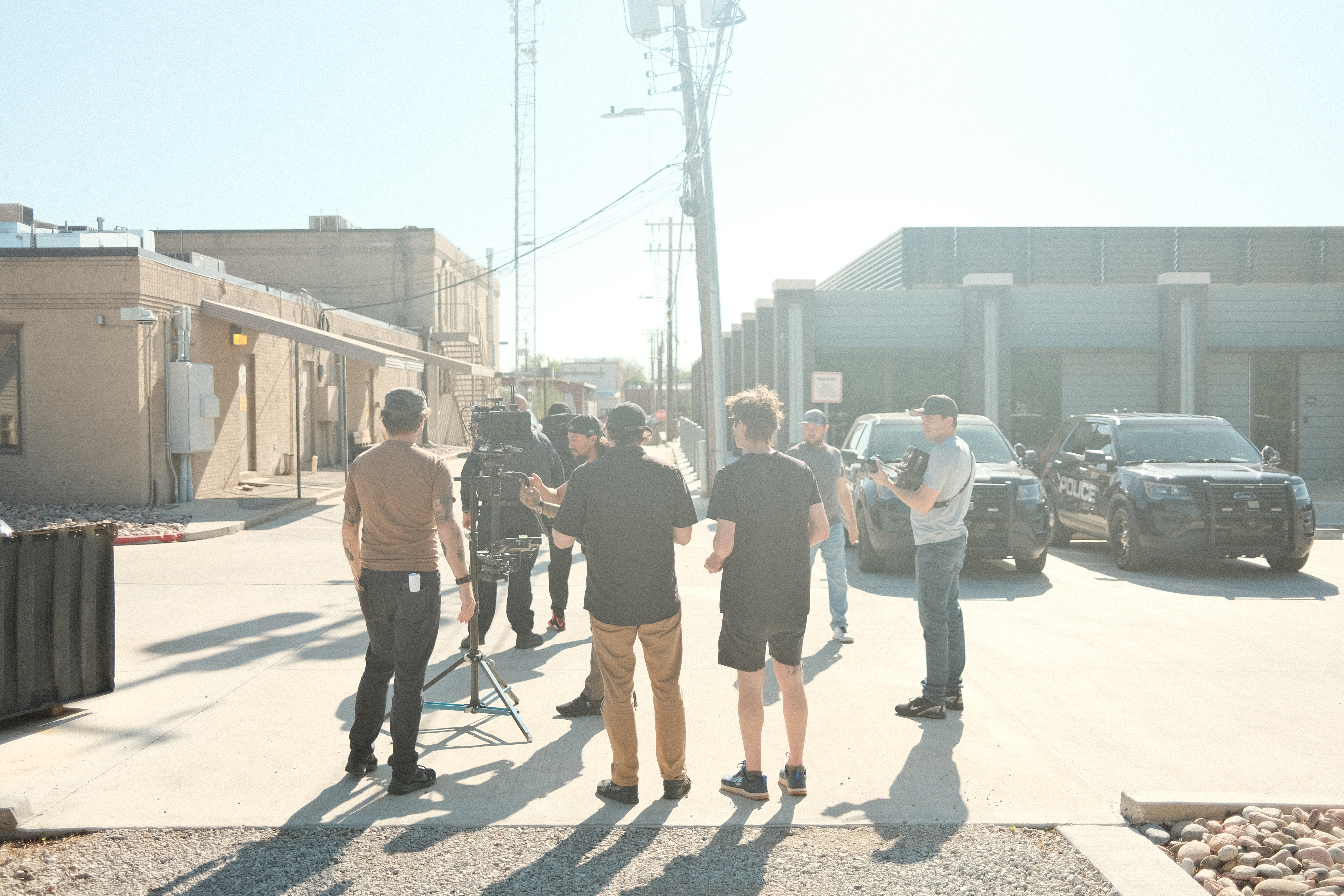 Filming the opening police call scene in Bixby, Oklahoma, April 2024. Image credit: Bruce James Bales. All images courtesy of the writer.