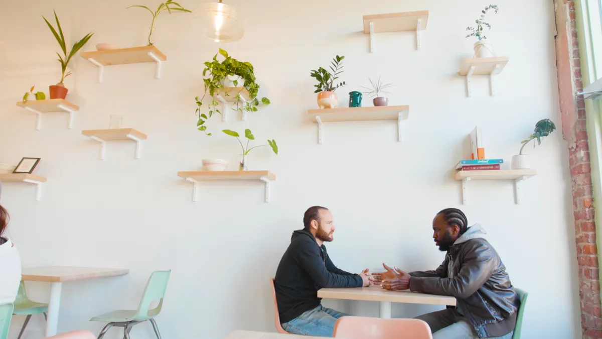 Tunde Wey interviews juice bar owner Dylan Maisel in New Orleans in November 2019. Credit: Theo Schear.