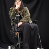 Woman sitting in an electric wheelchair, wearing a green jacket and long black dress.