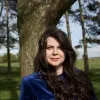Woman standing near a tree. She has long brown hair and is wearing a blue top.