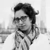 Black and white photo of a white woman with dark hair wearing glasses and a patterned scarf