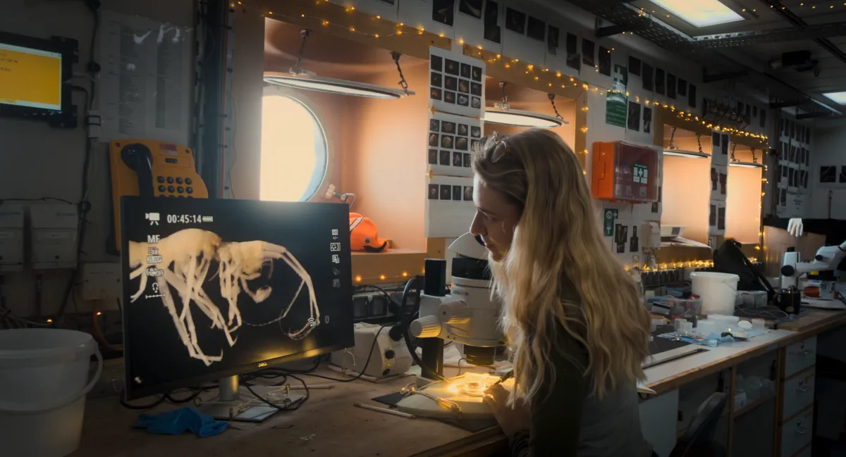On the clip, Mortimer explains, “This is from a part of the film I call ‘The Descent’: the moment the scientists send their underwater robot (Isis) into the abyss for the first time. We are in the central Pacific, in international waters, ten days away from the nearest land. The abyssal plain, a vast undiscovered ecosystem, lies 4,700 meters below us. For the next 12 hours, they will be glued to the live stream as the Isis, operated remotely from the ship, explores the seabed. The scientists are in a race against time to learn what animals inhabit this unseen part of the planet before deep-sea mining is given the go-ahead. I love this moment because it’s so full of anticipation for what we’re about to see—diving into blackness feels like delving into the subconscious—a space of dreams.”