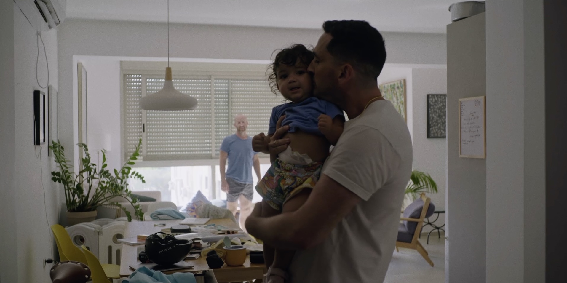A young brown-skinned man hugs and kisses a young toddler girl amid a slightly messy living room while a balding white man in shirt and shorts looks at them in the background