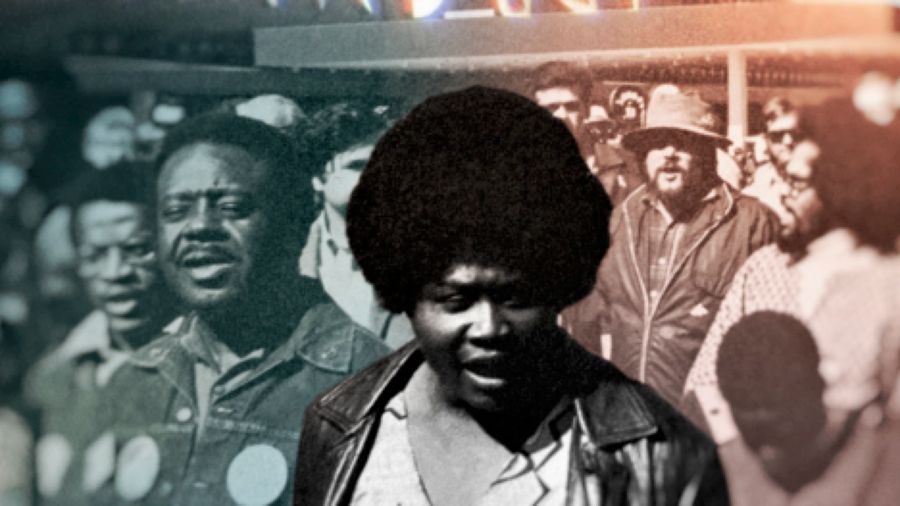 Las Vegas labor activist Ruby Duncan, a Black woman with an afro, wearing a leather jacket, leads a demonstration. From Hazel Gurland-Pooler's 'Storming Caesars Palace,' which won the Shine Award at BlackStar Film Festival. Courtesy of BlackStar Film Festival.