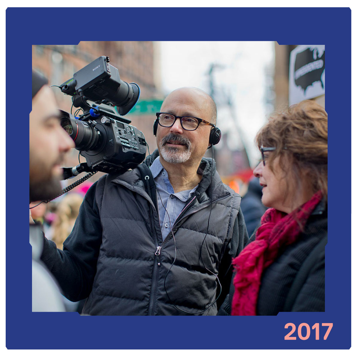Steven Ascher and Jeanne Jordan with soundperson Kevin Sweet filming the Women’s March in 2017 with a Sony FS7 cine camera.