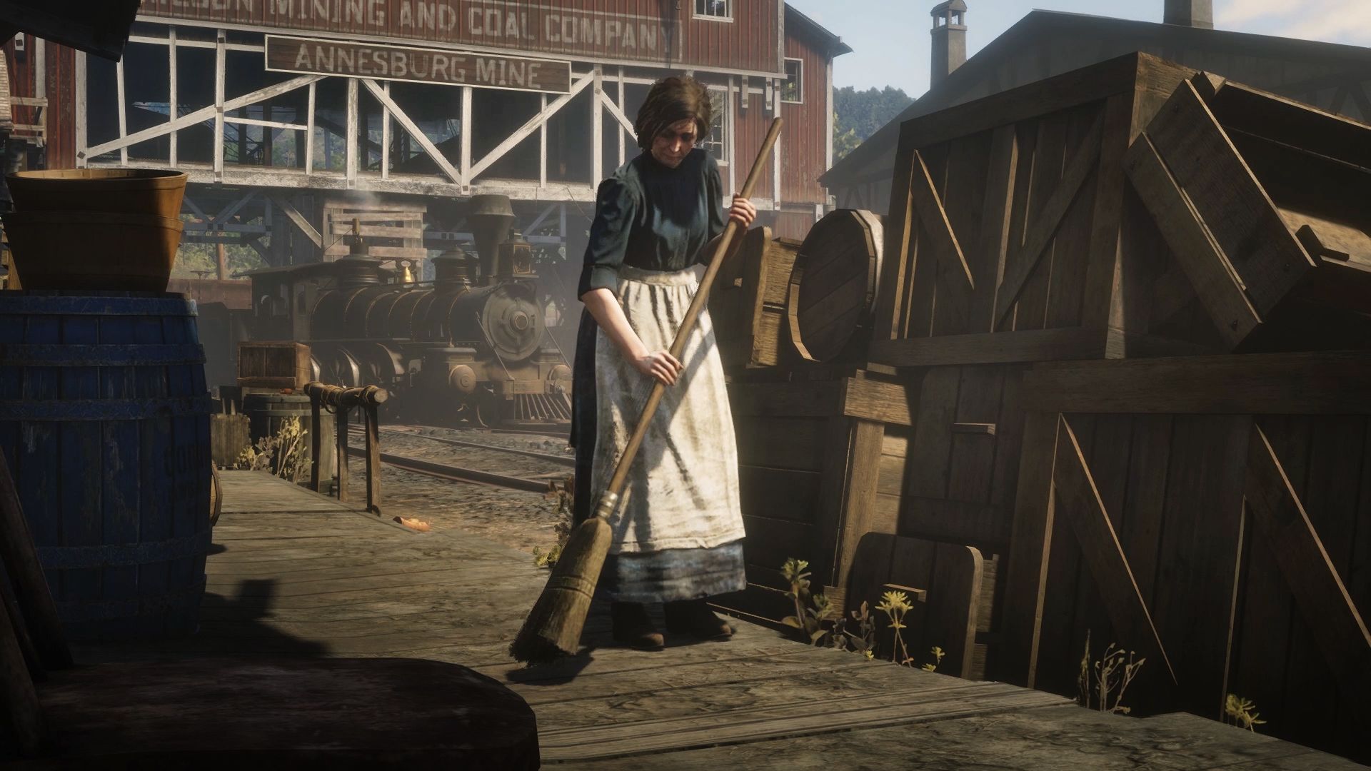 Screenshot of a NPC from Red Dead Redemption 2, sweeping a train platform with a broom.