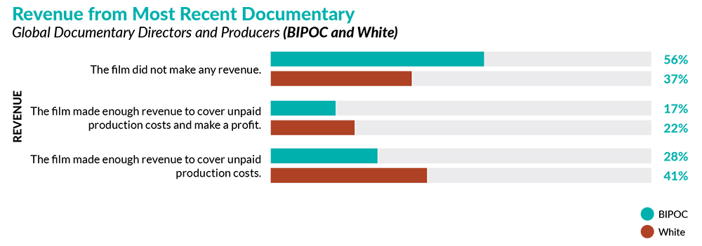 Overall, Black, Indigenous and People of Color (BIPOC) documentary professionals and primary makers (directors and producers) are having a different experience in the documentary industry than their white peers. In this study, BIPOC filmmakers attest to the importance of philanthropic foundations and public TV for their funding, film-based revenue, and distribution. BIPOC makers are more likely to make short-form nonfiction stories than white storytellers, and much less likely than white makers to garner film funding, documentary revenue, and personal income from streaming networks. BIPOC makers are much less likely than white makers to have made any revenue at all from their most recent documentary film; the majority did not receive any revenue.