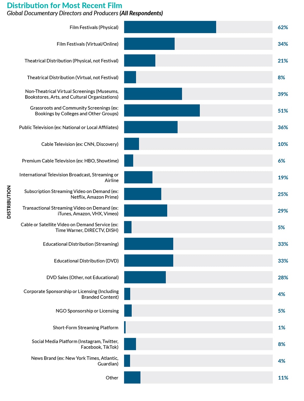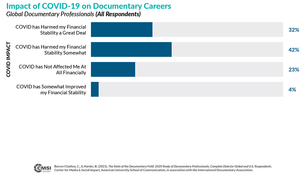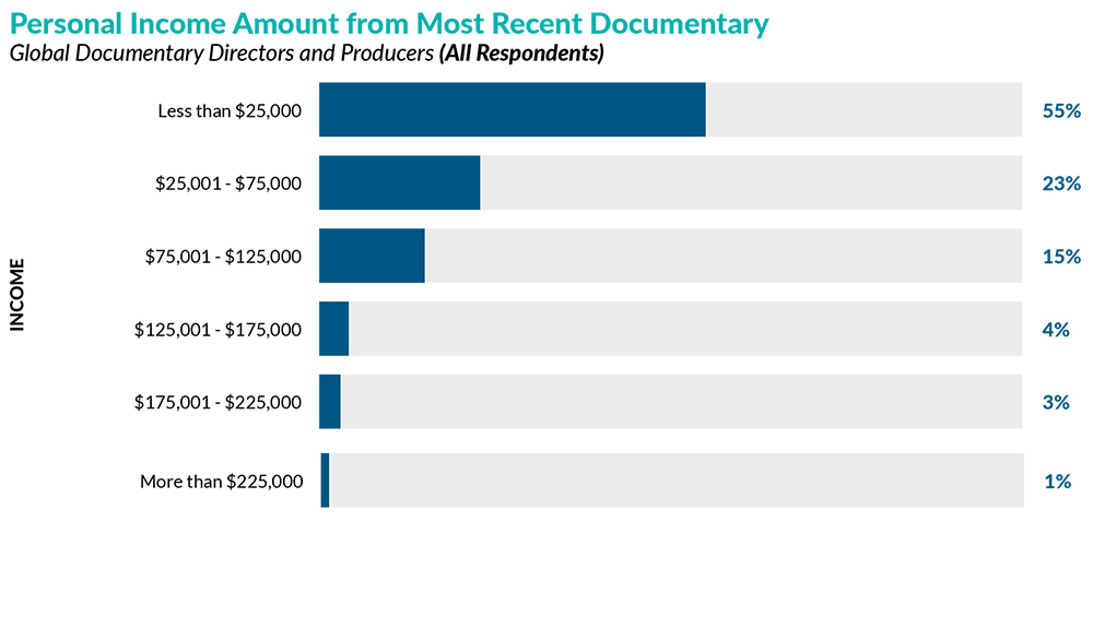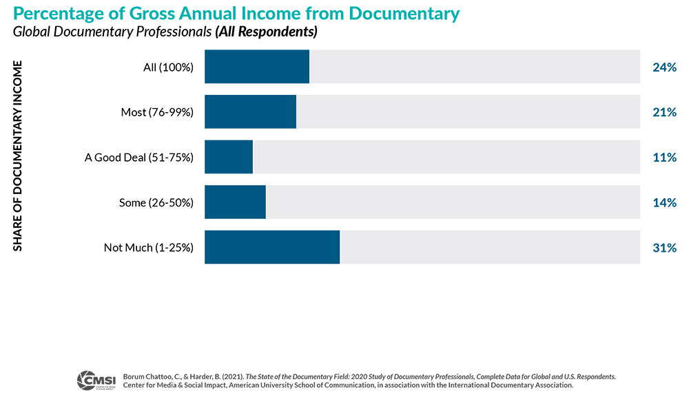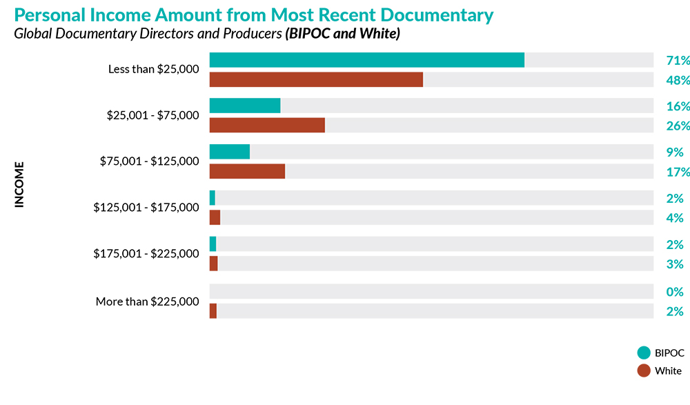 Economic issues are persistent challenges facing today’s documentary professionals. A small proportion of documentary professionals makes a full living from documentary work; the majority does other work to make a living. Less than a quarter of documentary filmmakers made enough money to cover production costs and make a profit from their most recent film; filmmakers who make a profit on their documentaries are still a rarity, not even close to the majority. Three-quarters of documentary professionals were negatively impacted financially by the COVID-19 pandemic. BIPOC and women-identifying filmmakers are the most economically disadvantaged in terms of film income, revenue, and access to bigger money that streaming networks can offer.