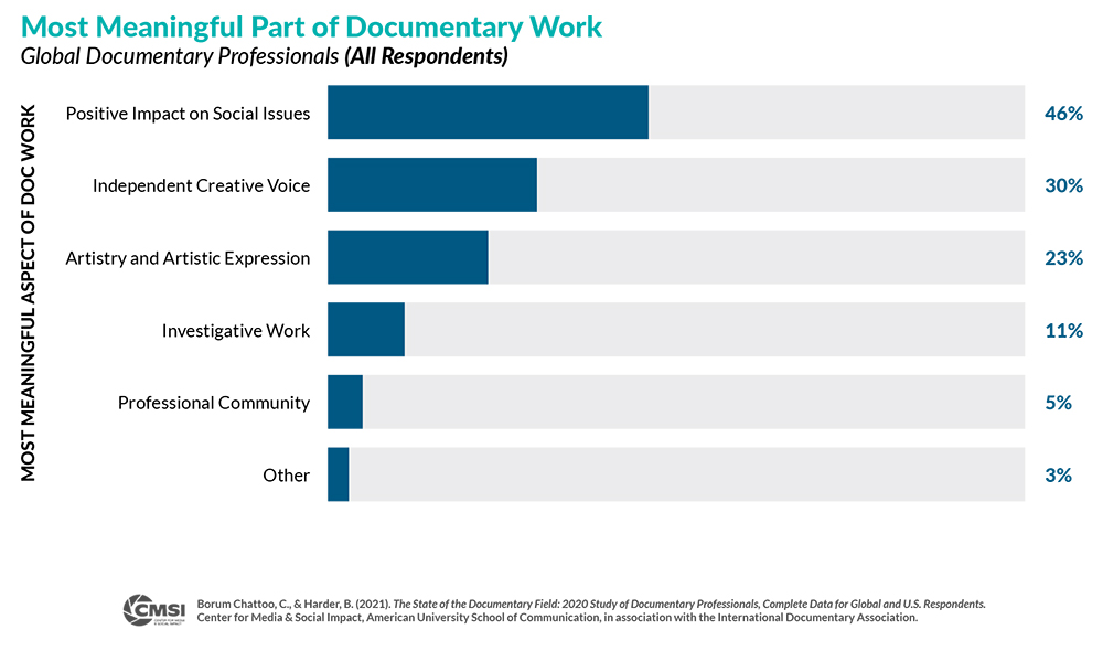 In this spirit, my organization, the Center for Media & Social Impact (CMSI), launched the first State of the Documentary Field research initiative—a large-scale survey of documentary professionals—in 2016, repeated in 2018 and again in 2020/2021. The State of the Documentary Field research initiative was designed to understand documentary industry members’ perspectives and lived experiences around economics, motivations, diversity and representation, funding, and changing platforms in the streaming media age. Crafted by CMSI in collaboration with IDA, the study was informed by insights and questions derived from the documentary community, along with our consultation with peer-reviewed and public-facing related research on similar topics.