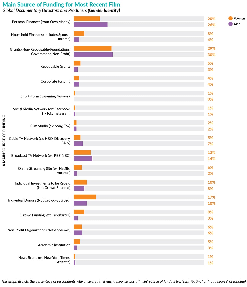 Gender identification is a meaningful differentiator in several financial categories. Women-identifying documentary professionals show some level of economic disparity in the film business. Women makers report needing to rely on sources of film funding that include household income and individual donors much more than men. Male-identifying filmmakers are more likely to be found making documentary income from streaming networks and series than women. Women makers were much less likely than men to have made any revenue at all from their most recent documentary film.