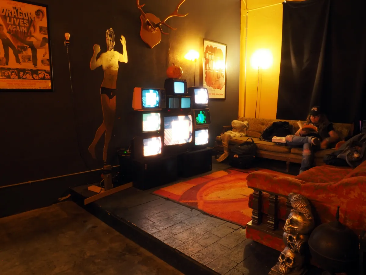Courtesy of Stray Cat Film Center. Interior of Stray Cat Film Center, a storefront microcinema in Kansas City.