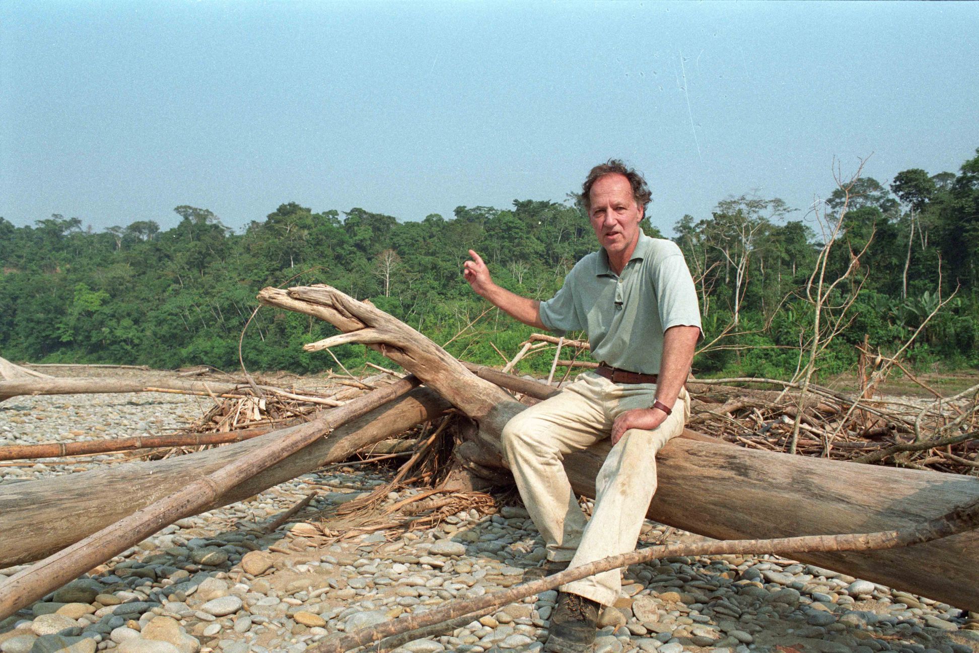 Years later, Herzog returned to the jungle to film his own documentary. My Best Fiend (1999), which turned 25 on October 7, was the director’s examination of his longstanding creative partnership with actor Klaus Kinski. Kinski agreed to play Fitzcarraldo when the original star, Jason Robards, was hospitalized midway through Fitzcarraldo’s production. My Best Fiend opens on footage of Kinski grandstanding before a large audience, shouting semi-coherently and comparing himself to Christ. The crowd cheers indiscriminately for both the rambler and his short-lived interlocutors. These archival clips—some of the only instances where Kinski, who died in 1991, is allowed to speak for himself—are both a sampling of the actor’s apparent lack of sanity and also a subtle suggestion that the man willfully leaned into his own spectacle in both art and life.