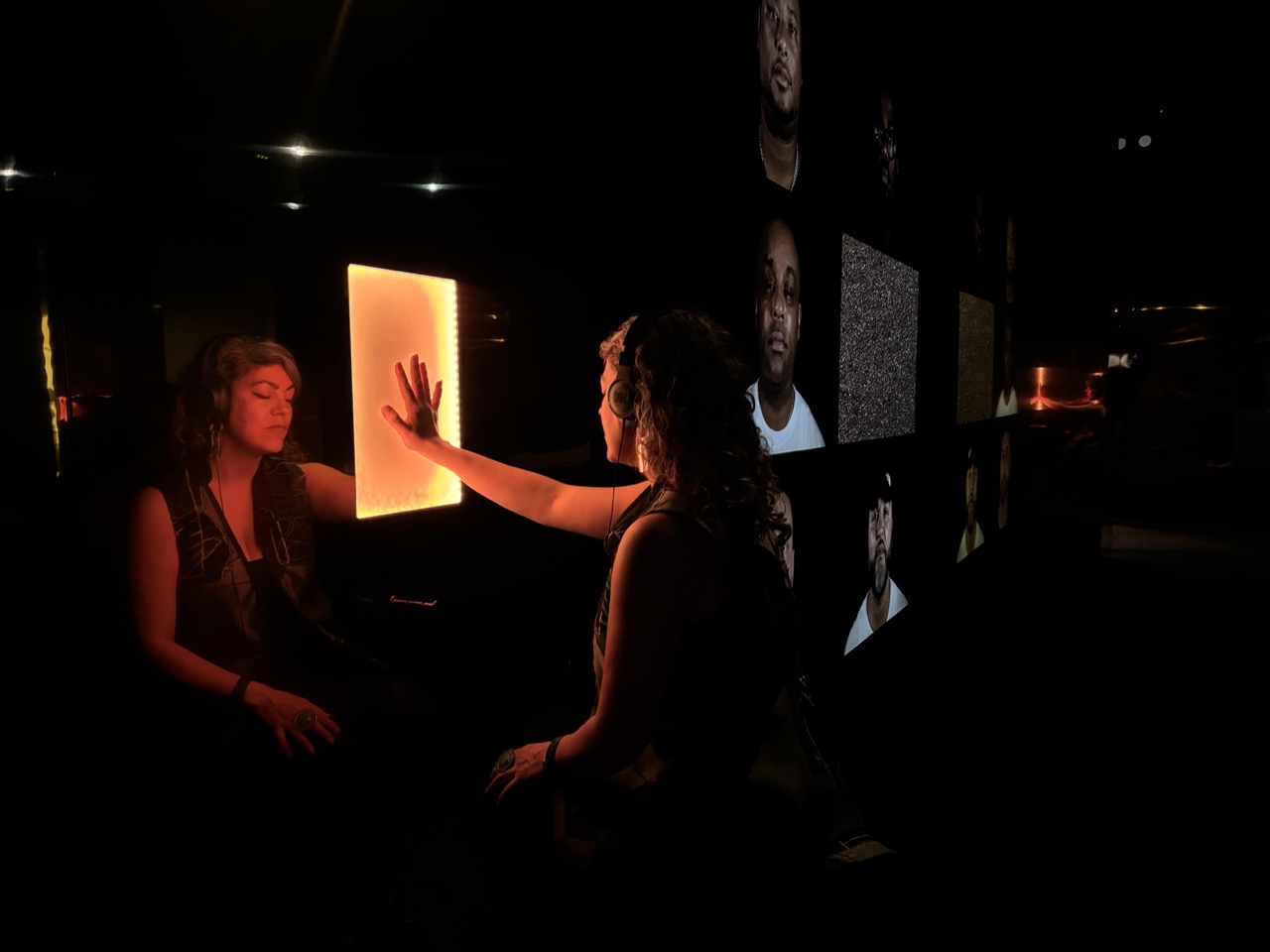 In one corner of the room, visitors are asked to partake in “deep-witnessing stations.” They can take a seat, put on individual headphones and activate audio stories when they keep their hand in place on a haptic wall panel. Audio interviews unfold for them, told by three fathers who chart the multiplicity of lives devastated by carceral separation.